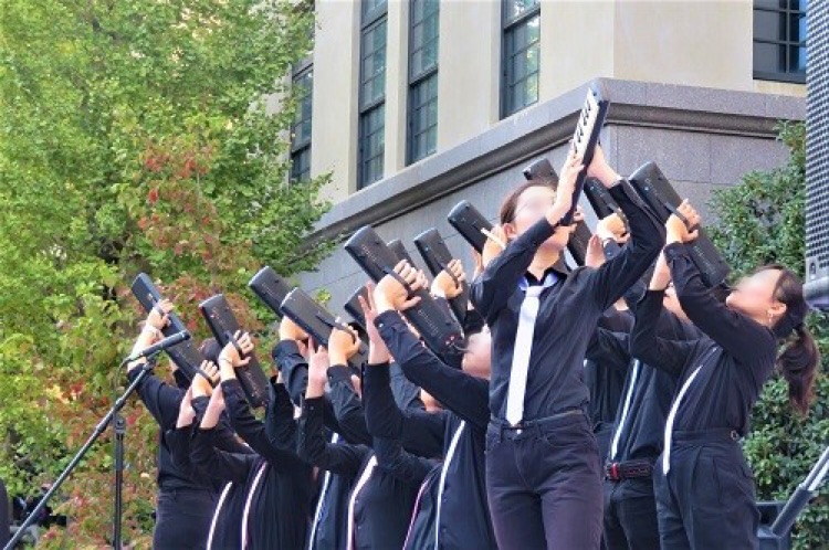電子ピアノの他に、カホン、トランペットなど様々な楽器を用いて演奏します。 また、ピアニカを演奏しながら踊るピアニカバンドなど、ピアノの会ならではのパフォーマンスに注目です。